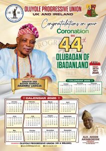 The Oluyole Progressive Union (OPU) once again congratulates His Imperial Majesty and the entire people of Ibadan. As we mark our days with the new calendar, we pray that each day of his reign brings greater blessings to the land.